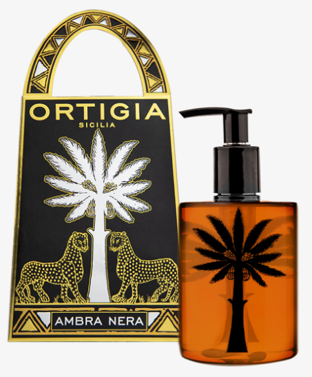 Ambra Nera flytande tvål med pump från Ortigia är en lyxig, handgjord tvål som använder helt naturliga ingredienser från Sicilien. Berikad med olivolja, en naturlig återfuktare, och vegetabilisk glycerin, ger denna tvål både en skonsam rengöring och intensiv vård för huden. Den friska och rena doften av kryddträ, mysk och bärnsten skapar en uppfriskande känsla och lämnar en subtil doft som dröjer sig kvar länge efter användning.