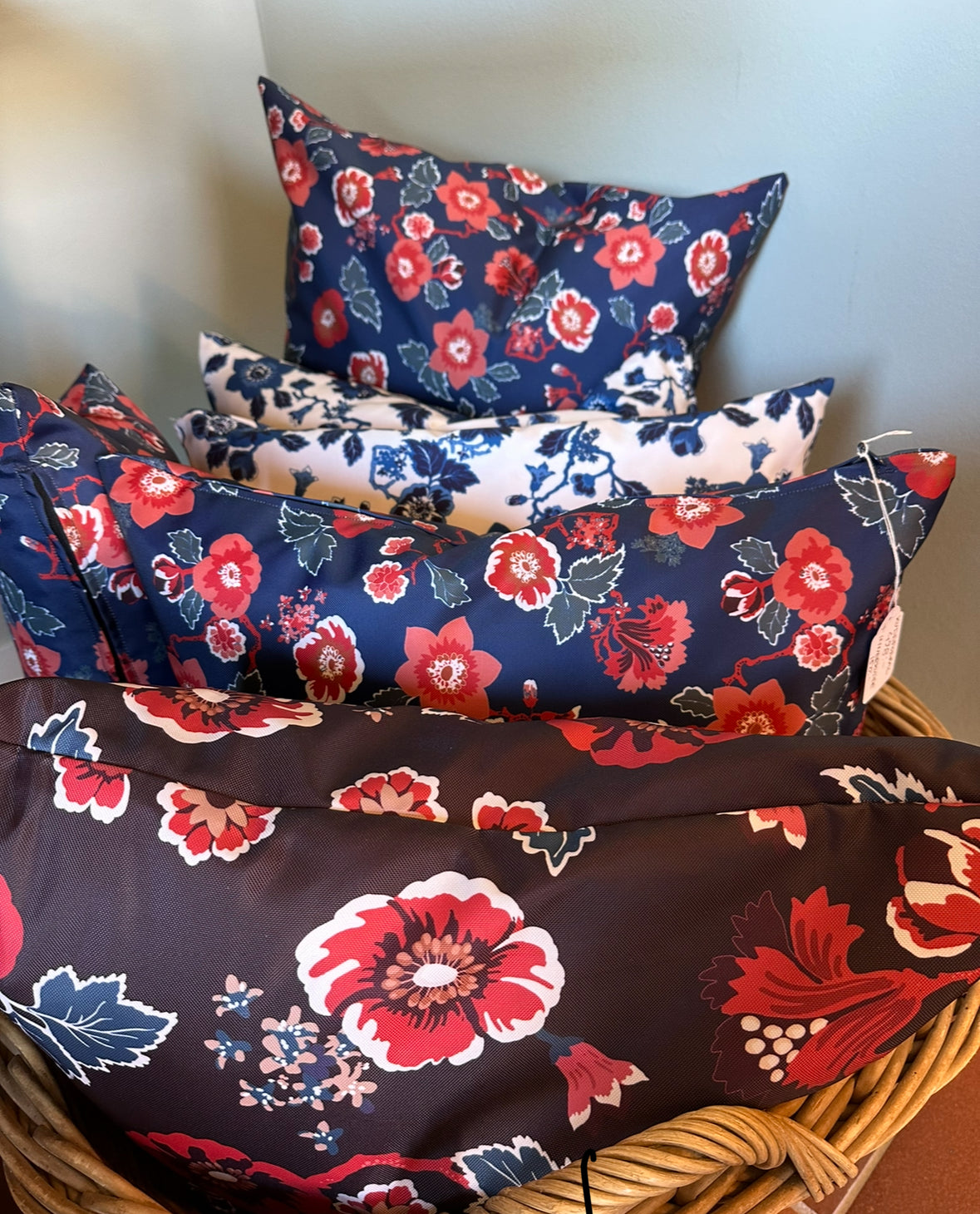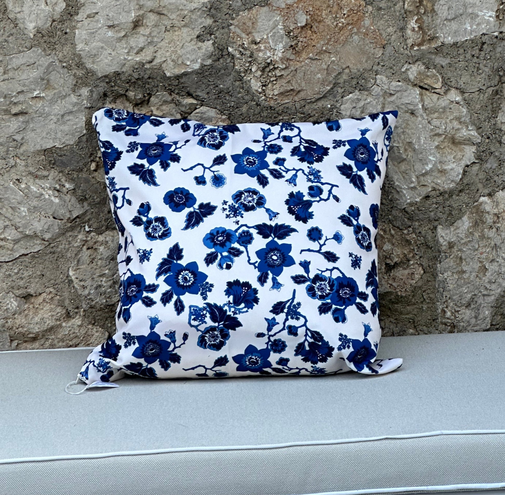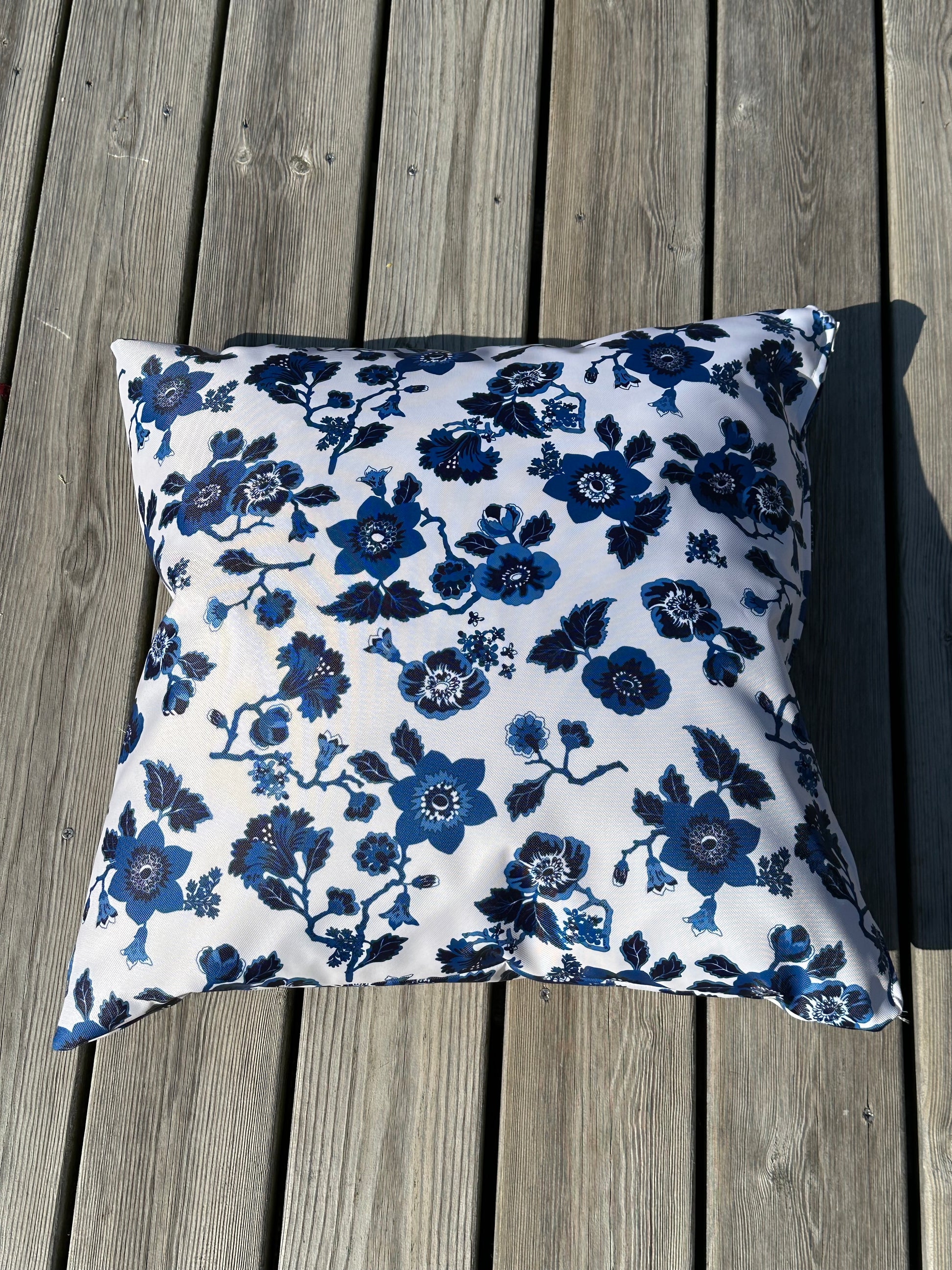 Kuddfodral blå blomma vit grund vattenavstötande tyg passar bra för utomhusbruk, lika fin i en soffa, stol som i båten.