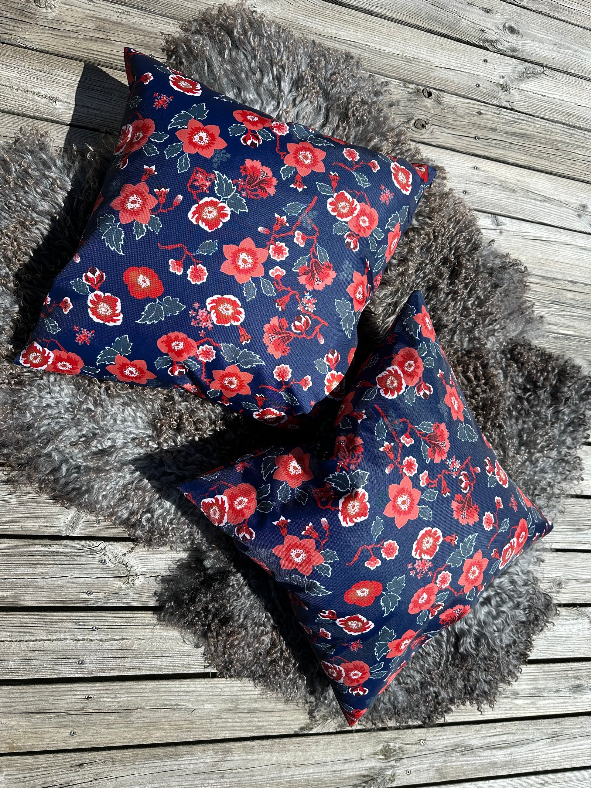 Kuddfodral röd blomma blå grund vattenavstötande tyg passar bra för utomhusbruk, lika fin i en soffa, stol som i båten.